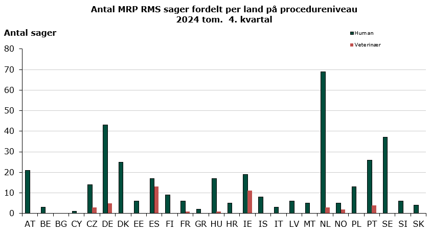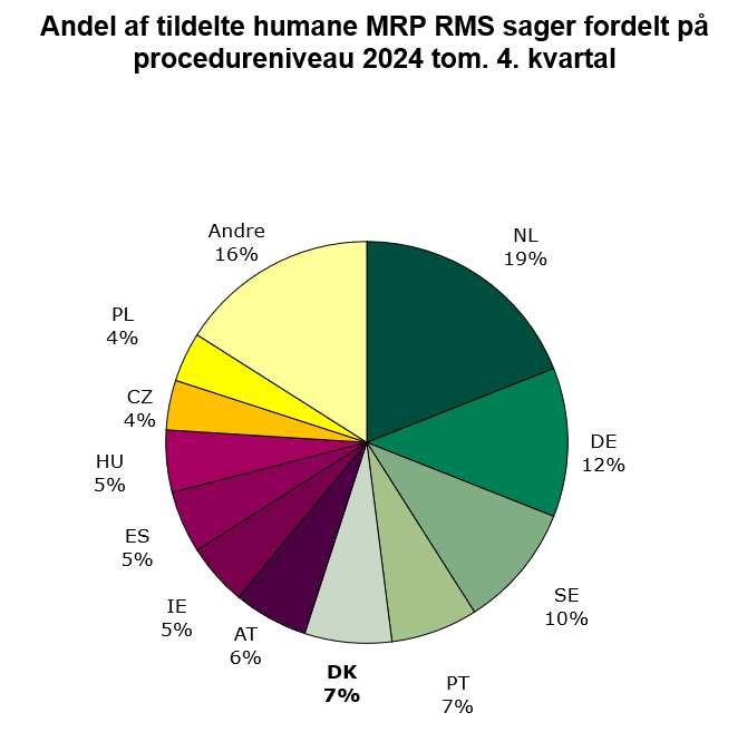 Status for 2024 tom. 4. kvartal: Danmark er referenceland for 25 påbegyndte humane MRP sager og 0 veterinære MRP sager målt på procedureniveau, hvilket svarer til henholdsvis 7 % og 0 % af alle påbegyndte MRP sager.