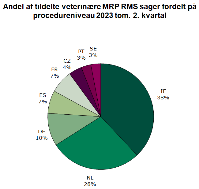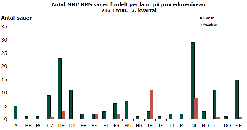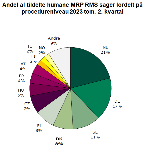 Status for 2023 tom. 2. kvartal: Danmark er referenceland for 11 påbegyndte humane MRP sager og 0 veterinære MRP sager målt på procedureniveau, hvilket svarer til henholdsvis 8 % og 0 % af alle påbegyndte MRP sager.