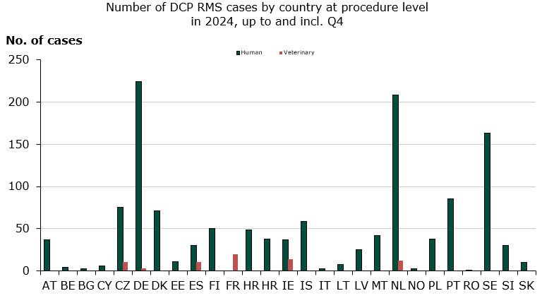 Status for 2024 up to and including 4th quarter: Denmark has initiated 71 human DCP procedures and 1 veterinary DCP procedures, which is respectively 5 % and 1 % of all assigned DCP procedures in 2024.