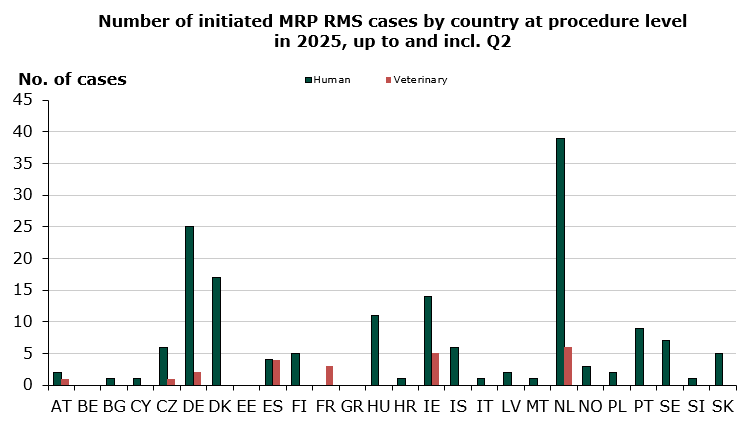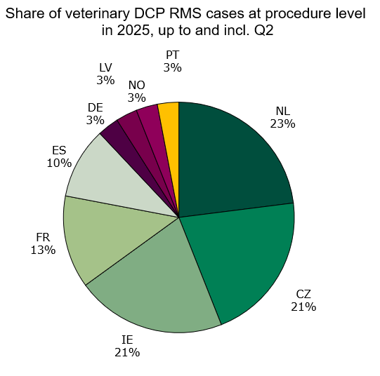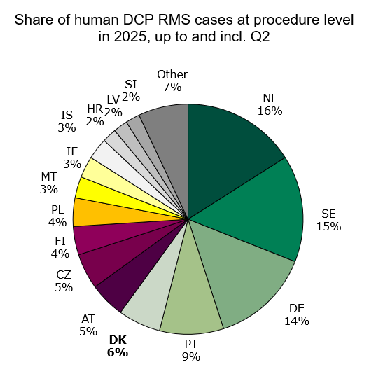 Status for 2025 up to and including 2nd quarter: Denmark has initiated 43 human DCP procedures and 0 veterinary DCP procedures, which is respectively 6 % and 0 % of all assigned DCP procedures in 2025.