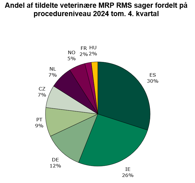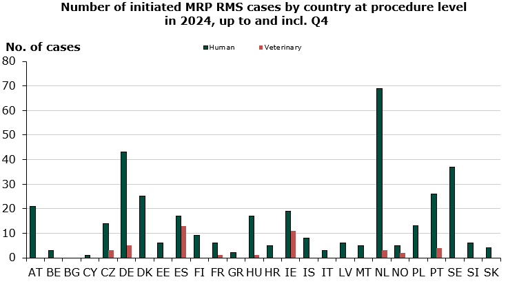 Status for 2024 up to and including 4th quarter: Denmark has initiated 25 human MRP procedures and 1 veterinary MRP procedure, which is respectively 7 % and 0 % of all assigned MRP procedures in 2024.
